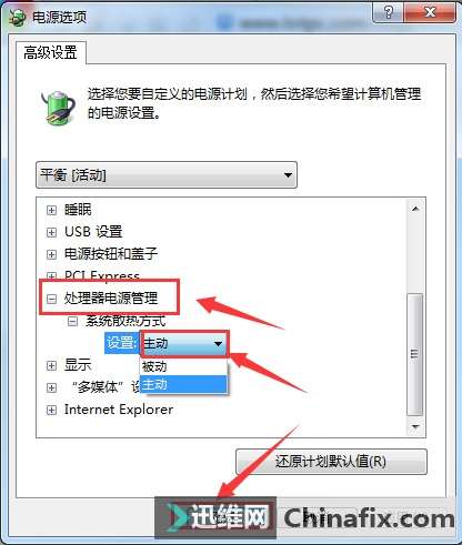 3、查看下“處理器電源管理”項目下的“系統散熱方式”,如果是系統默認的“被動”,將其改成“主動”。如圖所示: