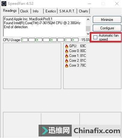 2、下載完成啟動后它會在界面直接顯示出電腦硬件的溫度(主要是處理器、主板和顯卡的溫度),可以勾選“Automatic fan speed”讓它自動控制風扇。如圖所示: