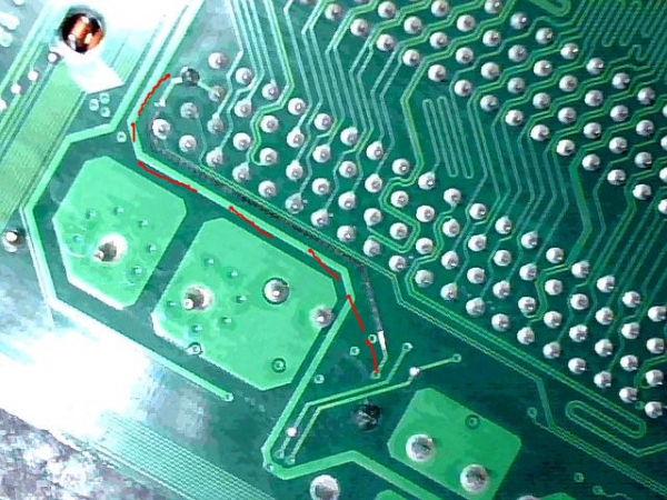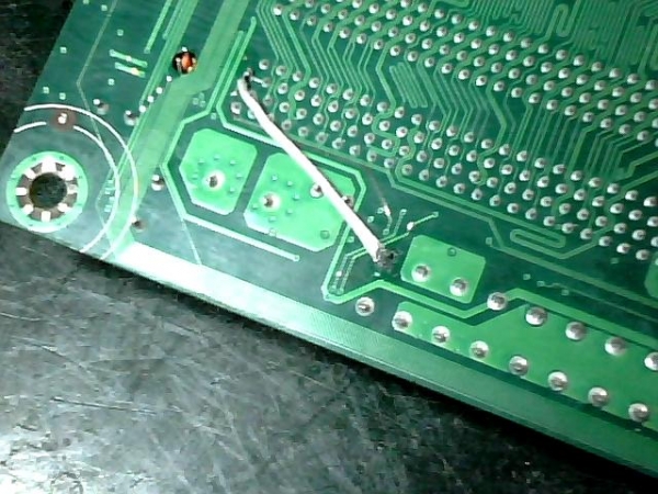 思考的過程中,突然想到,這塊主板沒有被修過的痕跡,一般情況下,這種沒被修過的板子很少出現(xiàn)兩處或者多處故障,那么這塊板子的故障肯定與內(nèi)存有關(guān)系,還是先把斷線補(bǔ)上再說吧,