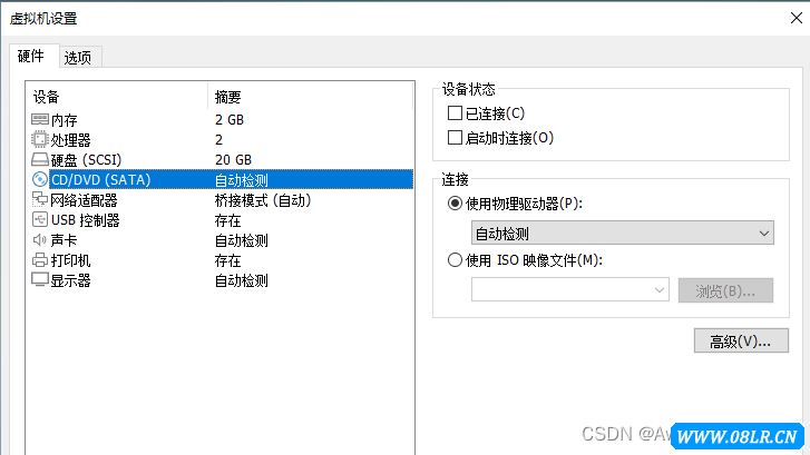 關閉虛擬機,打開虛擬機設置,找到CD/DVD,改為使用物理驅動器,把配置改成自動檢測。再重啟虛擬機,就可以安裝VMware Tools了。