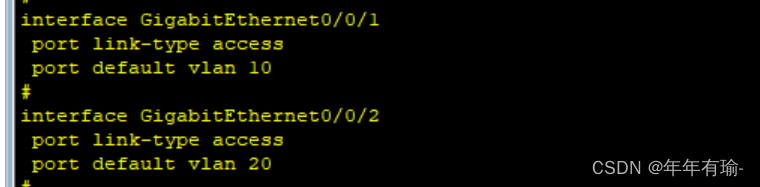 進入g/0/0/1端口,配置接口模式為access,允許vlan10的流量通過,進入g/0/0/2端口,配置接口模式為access,允許vlan20的流量通過。