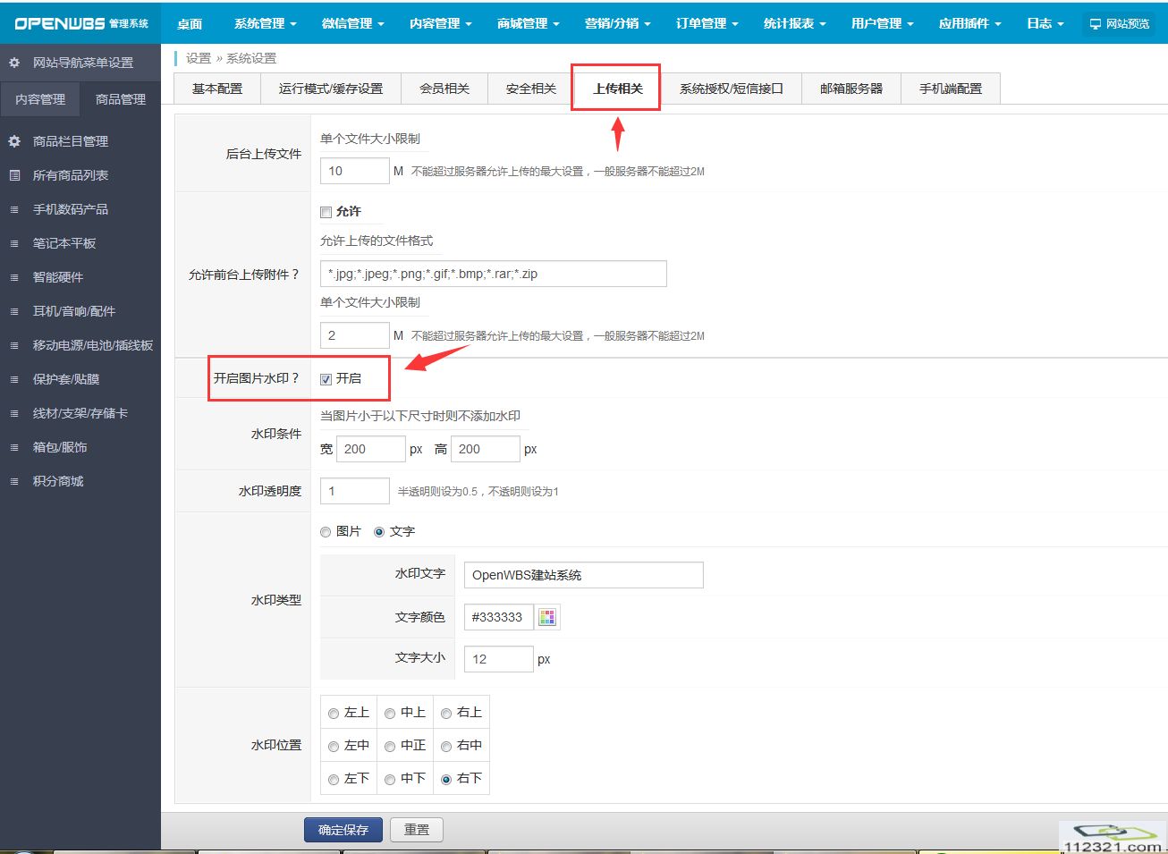 四. 進入網站管理后臺開啟OpenWBS系統設置里的開啟圖片水印