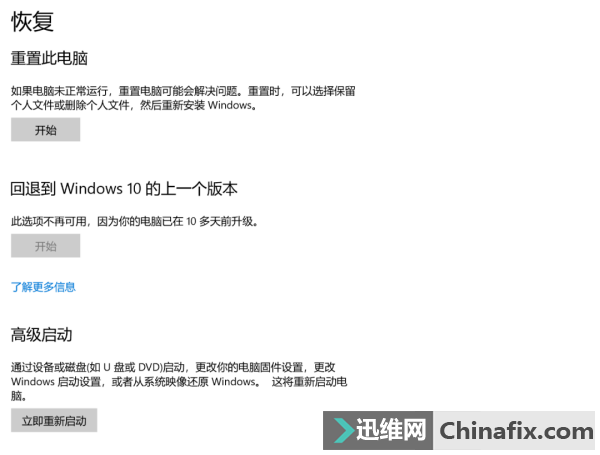 確保文件和工作都已保存,準備好后,再次點擊“立即重新啟動”。系統重啟后將出現恢復環境“選擇一個選項”屏幕。