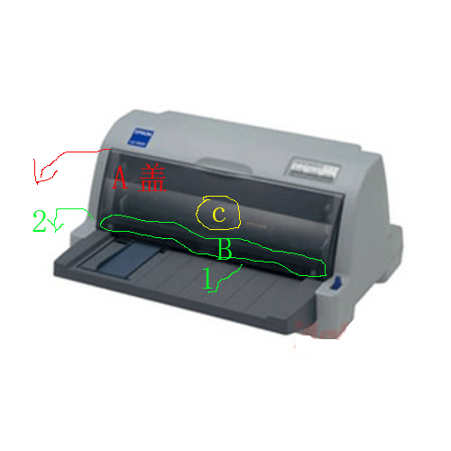 EPSON-635針式打印機換色帶方法圖解。步驟共分為四步,按照下圖指示分為ABCD。前三個步驟是取下色帶和色帶盒,第四步是把換好的新色帶盒裝上去,詳細圖解如下: