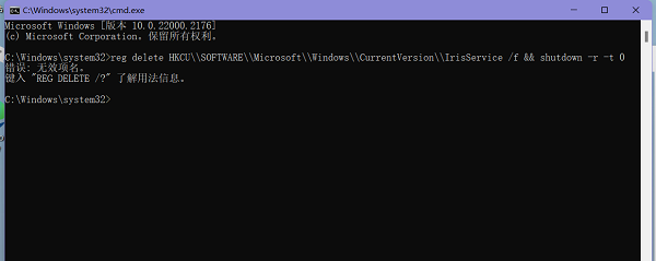5、粘貼以下命令并按下回車鍵以運行它:reg delete HKCU\\SOFTWARE\\Microsoft\\Windows\\CurrentVersion\\IrisService /f && shutdown -r -t 0電腦重新啟動后恢復正常,原理就是卸載最近更新的一個補丁。