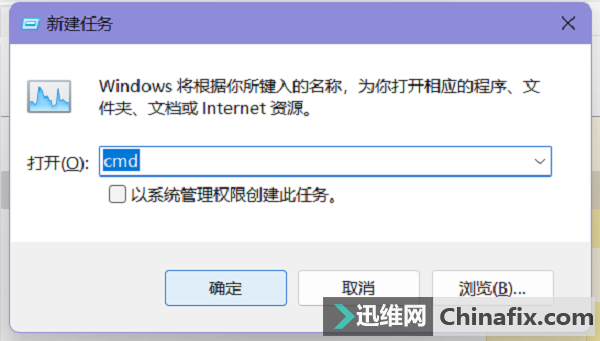 4、在新建任務窗口,輸入欄里輸入“cmd”接著按下回車鍵或者點擊下方【確定】。
