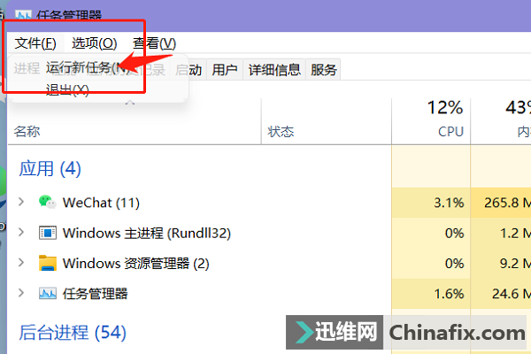 3、左上方點擊【文件】后展開選項欄,從中選擇【運行新任務】。