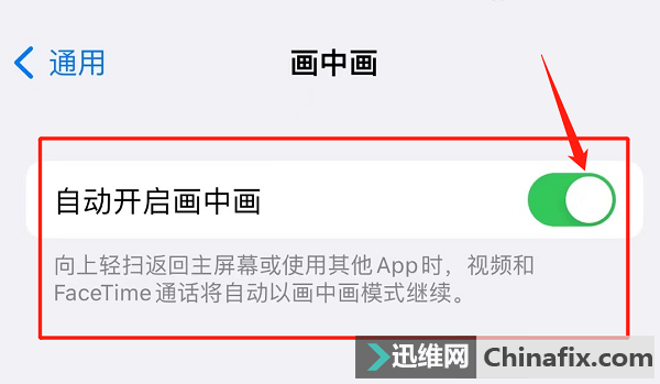 3、進來后就能看見【自動開啟畫中畫】,我們把它后面的開關(guān)按鈕點亮。綠色則為開啟,灰色為關(guān)閉。