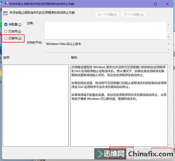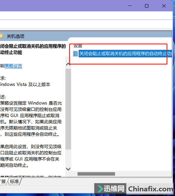 3、接著我們就能在右側窗口配置欄當中看見【關閉會阻止或取消關機的應用程序的自動終止功能】,點擊打開;