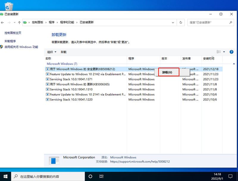 3、然后找到對應的KB5008212補丁,鼠標右鍵點擊卸載即可。