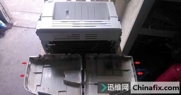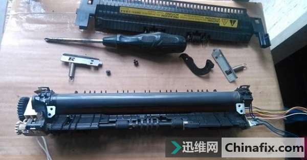 店里的惠普1020黑白激光打印機壞了,故障是卡紙不出紙。根據我修理的經驗,應該是定影輥上的齒輪橡皮圈磨損脫落,或者是加熱輥上的潤滑脂沒了,導致定影膜不能與定影輥同步轉動才卡住紙張。只有拆開才能解決。圖片是手機拍的,通過畫圖工具加上紅色箭頭,方便找到螺絲一步步拆開。圖片不太清楚。請原諒。