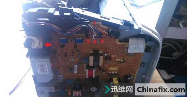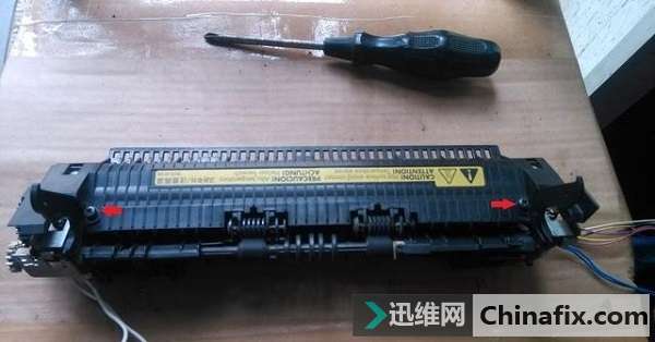 再拆掉箭頭所指的一根紅色粗線,把定影組件上的3個固定螺絲拆掉。在箭頭處。