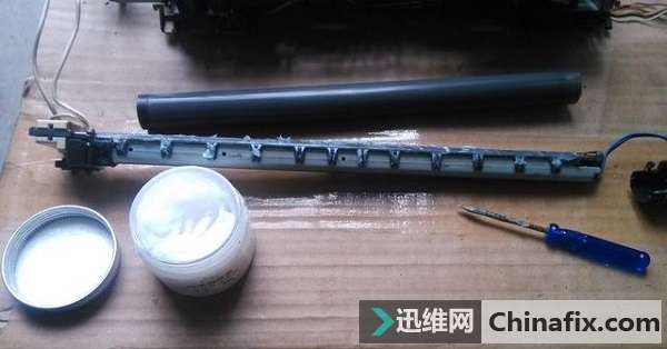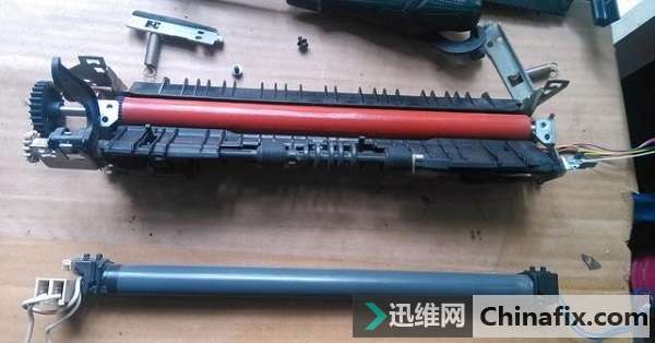 拆出加熱輥。用手轉動定影膜,發現轉不動。里面沒有潤滑脂了。