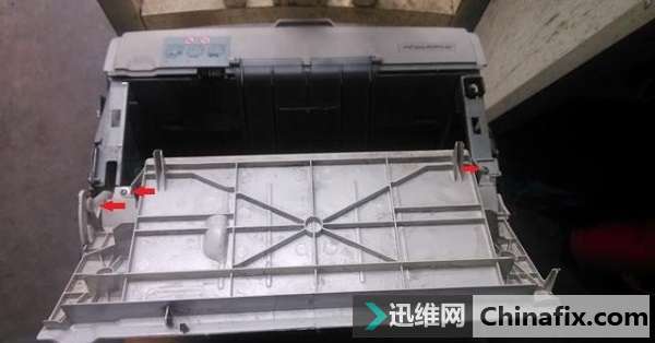 把打印機翻轉,拆掉紅色箭頭處的3個螺絲。