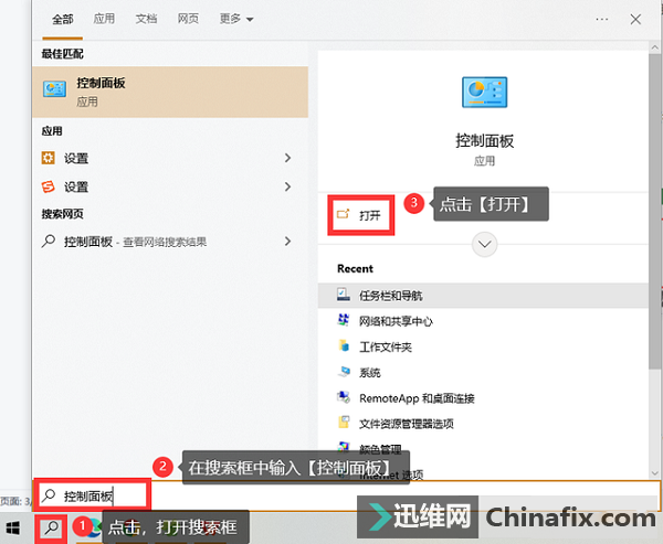步驟1:在電腦桌面左下角【搜索框】中輸入【控制面板】,點(diǎn)擊打開(kāi)。