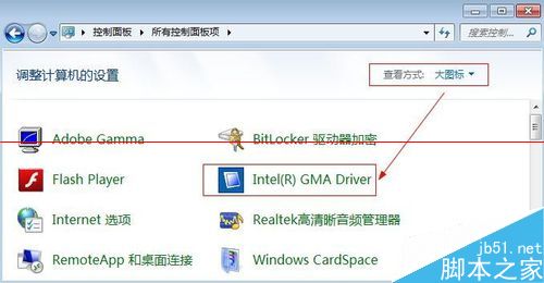 4、在控制面板中將這里的查看方式改為大圖標,然后這里找到圖形控制器打開!比如小編這里顯示的是Intel (R) GMA drive【Intel集成顯卡驅(qū)動】如果你是獨立顯卡的話,這里顯示和小編電腦肯定是不一樣的。