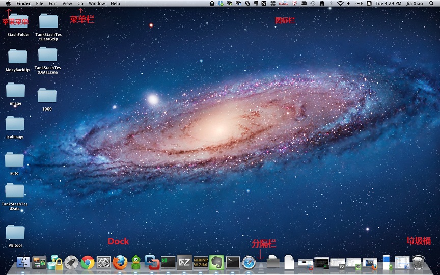 菜單欄: 表示你目前正在運(yùn)行的程序的菜單欄。 (這個(gè)設(shè)計(jì)比較好, 在Windows上如果打開(kāi)3個(gè)Firefox, 每個(gè)Firefox都有菜單欄。 但是在Mac上,就只有一個(gè)統(tǒng)一的菜單欄)