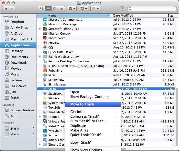 打開(kāi)Finder, 到Application文件夾下,找到你要卸載的軟件,右鍵,選擇Move To Trash. 就卸載好了。