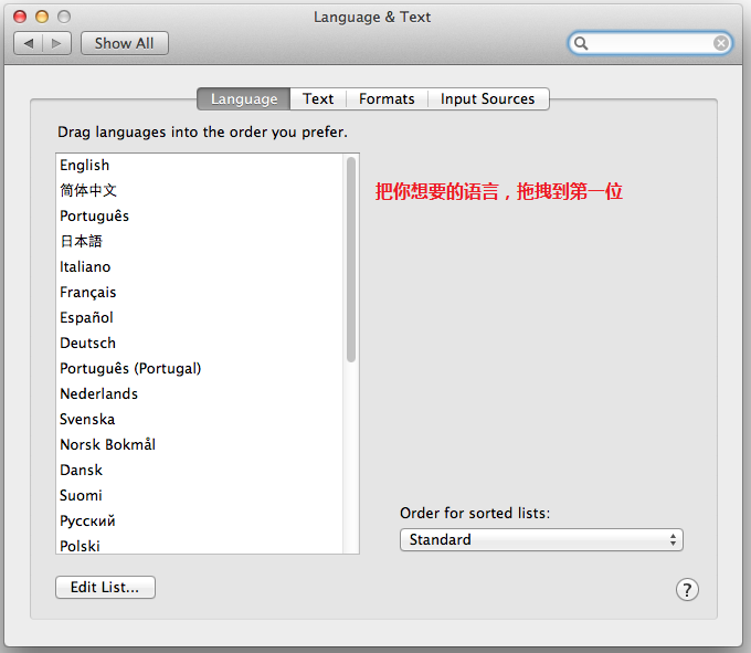 打開(kāi)System Preferences ->Person下的Language&Text->Launage下。 把你想要的語(yǔ)言拖拽到第一位