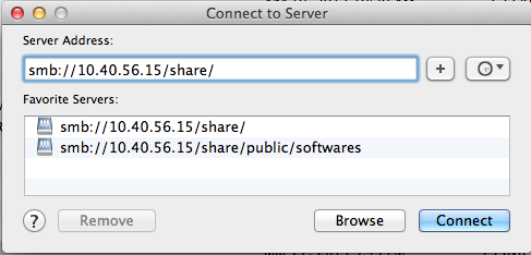 在Mac中, 先打開(kāi)Finder, command +K 打開(kāi)共享目錄 輸入: smb://192.168.0.4/share