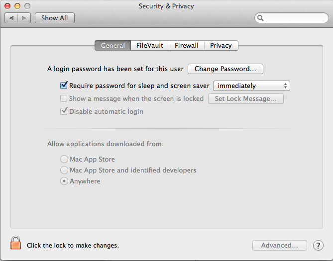 2. 然后在System Preferences里面的Security里面的General標(biāo)簽選擇“Require password to week this computer from sleep or sreen saver.”選項(xiàng).