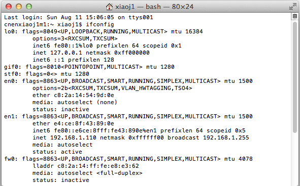 啟動(dòng)Terminal, 輸入命令 "ifconfig"