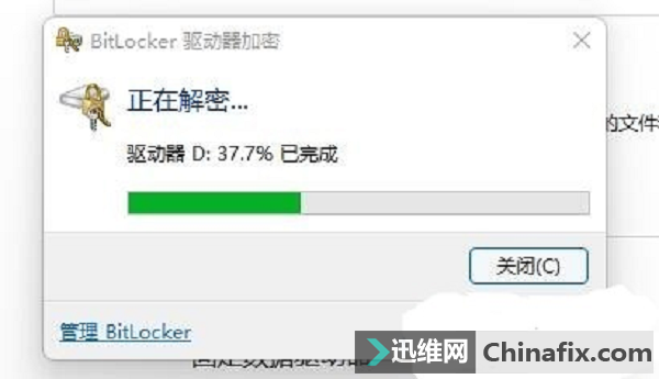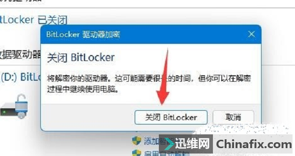 4.隨后會彈出Bitlocker驅動器加密提示窗口,用戶直接按下關閉Bitlocker按鈕即可解決問題;