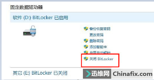 3.在打開的管理Bitlocker窗口中,在軟件(D:)Bitlocker已啟用板塊中選擇關閉Bitlocker選項;