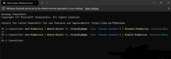 獲取-PnpDevice | Where-Object {$_.FriendlyName -like ‘*touch screen*’} | Enable-PnpDevice -Confirm:$false