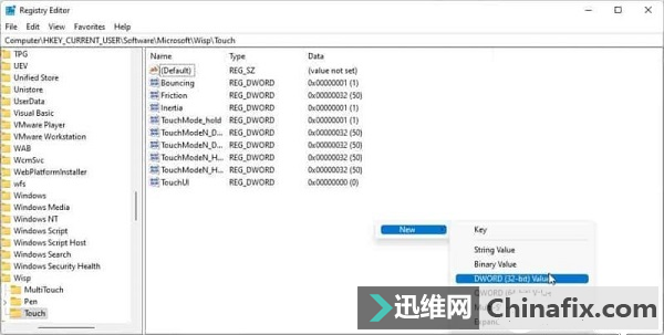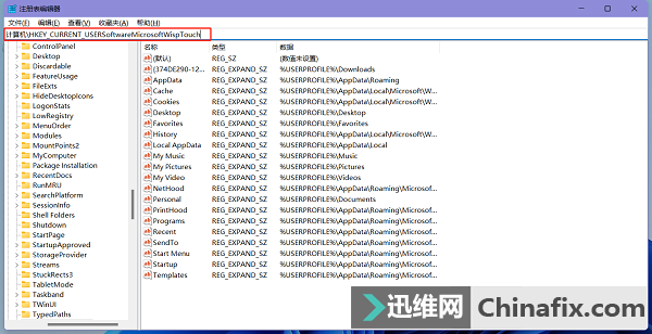 3、復制鏈接HKEY_CURRENT_USERSoftwareMicrosoftWispTouch并將其粘貼到注冊表編輯器的地址欄上,然后按 Enter。