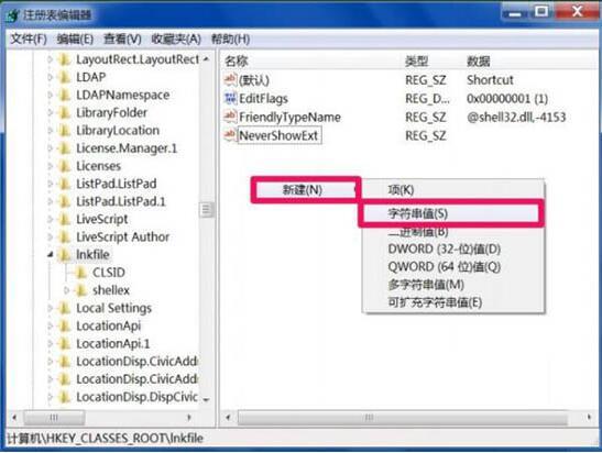 5、到lnkfile右側(cè)窗口,新建一個字符串值,具體方法,在空白處右鍵,選擇“新建”子菜單中的“字符串值”。