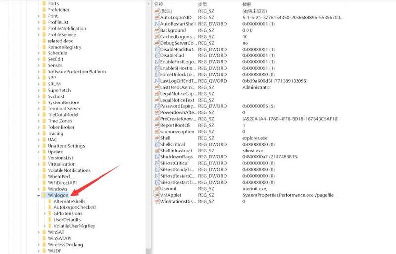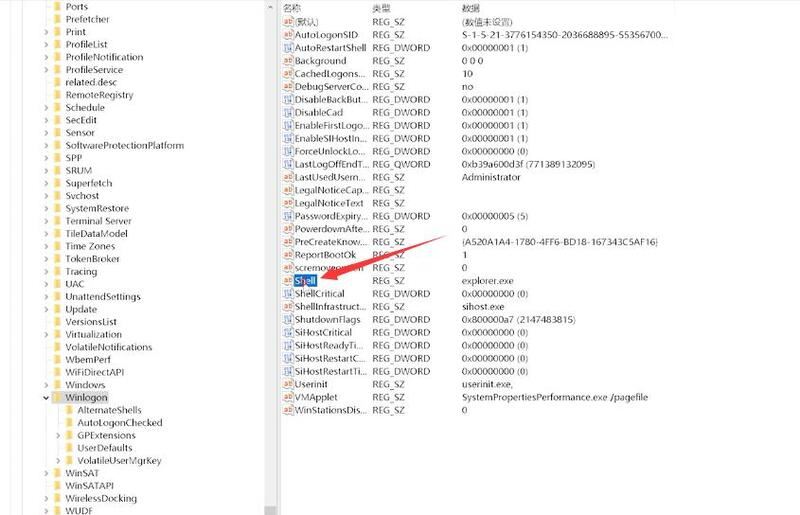 3.選中Winlogon,在右側找到Shell,并雙擊它打開編輯字符串