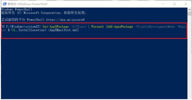 2、輸入并執行以下代碼【Get-AppXPackage -AllUsers | Foreach {Add-AppxPackage -DisableDevelopmentMode -Register “$($_.InstallLocation)\AppXManifest.xml”}】。