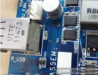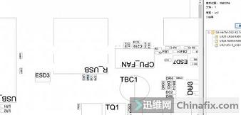 今天來了快板子,客戶說前置USB能用后置的不能用。 于是開始檢查。開機測試,用ps2的鍵盤進bios,查看usb設置,正常,然后看了下usb鼠標,燈亮,但是動不了,這說明了供電正常,但是數據不正常。 于是開始測量,5v供電果然正常,斷電打對地阻值,也都正常。 打開圖紙,直接翻到橋的usb模塊,觀察一番后鎖定信號-USBOC_R -USBOC_R和-USBOC_F,R為后置usb口的,F為前置usb口的。于是追查信號R 該信號為后置USB口供電分壓得來,打開點位圖,發現這兩個電阻就在USB口邊上 遂測量,發現只有0.9v左右的電壓,這明顯不正常。分壓電阻分出來的電壓大小應該在3.2v左右 于是,從料板上找了一個1k和一個2k的電阻換上 上電測試3.3v正常,進bios測試,后置usb口恢復正常,維修到此結束