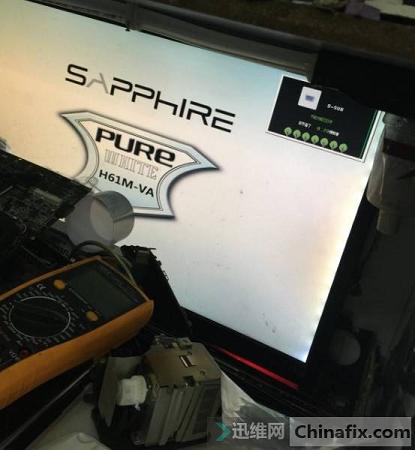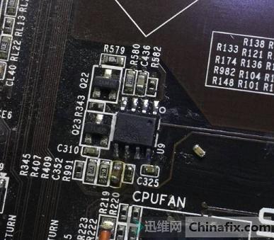 先目測了一下無進水 也無維修過的痕跡,接下來先清理了主板上的灰塵(個人習慣,看見主板上臟不垃圾就不爽)。大體上清理之后接上電源,測試開機針上有3.3V。短接之后風扇轉1分鐘左右掉電,再次觸發可以上電。測試無CPU供電。測試UP1625的34腳無電壓信號,苦于找不到主板的圖紙只能盲修,繼續測試主板的其它供電,測試的同時摸了一下H61的橋 發現溫度稍微有點偏高,心里還在想是不是橋壞了導致溫度高。經?凑搲是有好處。了解到橋發燙一種就是短路壞掉 再一種就是缺電壓。那么先測試一下橋的供電,在橋旁邊的兩個0歐姆電阻上測到0.45V的電壓,心里立馬有數了 本該1.05的電壓被拉低到0.45,順藤摸瓜找到1.05V的供電芯片AS358M-E1 一般我喜歡先測試旁邊的電容(這種8腳芯片旁邊的電容愛壞,論壇里看到的 類似GA主板上的8120D供電芯片旁邊的電容電阻也超愛壞)一測試果不其然連接芯片5腳上的電容竟然有400多歐姆的阻值 直接換下