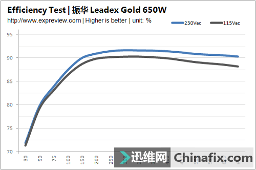 振華Leadex Gold 650W電源的效率曲線